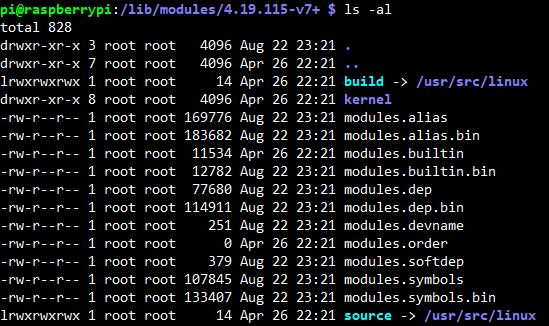 /lib/modules/4.19.115-v7+ 디렉터리에서 ls -al 명령어를 사용하면