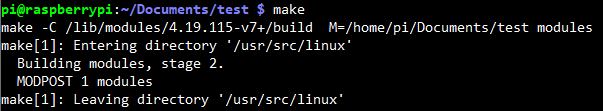 obj-m := test.o KDIR := /lib/modules/$(shell uname -r)/build PWD := $(shell pwd) default: make -C $(KDIR) M=$(PWD) modules clean: make -C $(KDIR) M=$(PWD) cleanpi@raspberrypi:~/Documents/test $ make