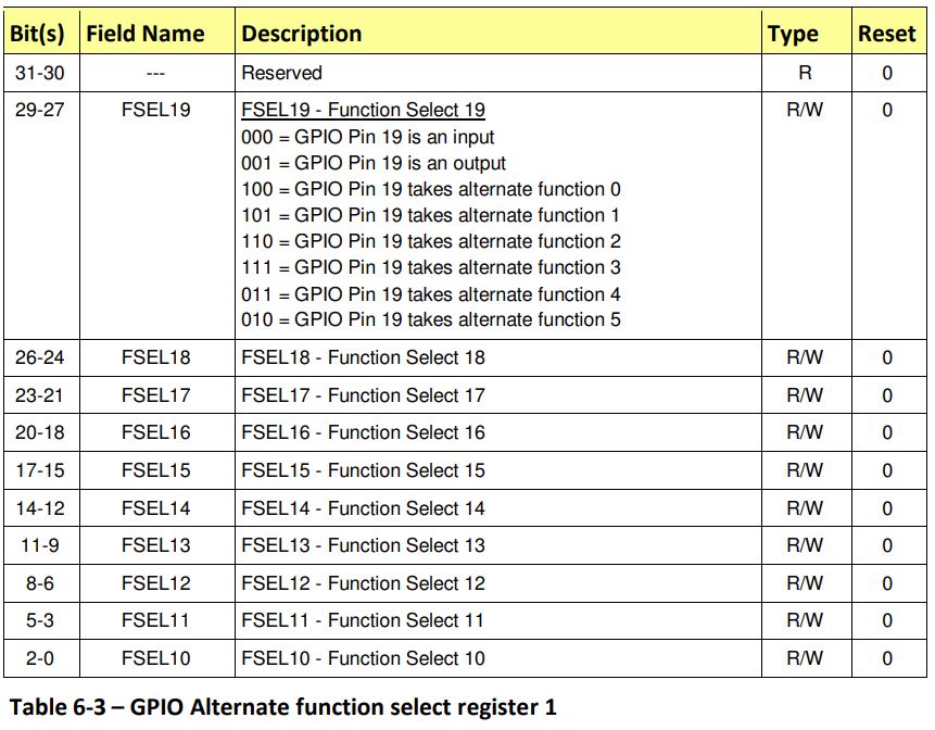 위 그림을 보면 GPIO 18번 핀은 GPFSEL1 레지스터 26-24비트로 output mode로 설정할 수 있다.