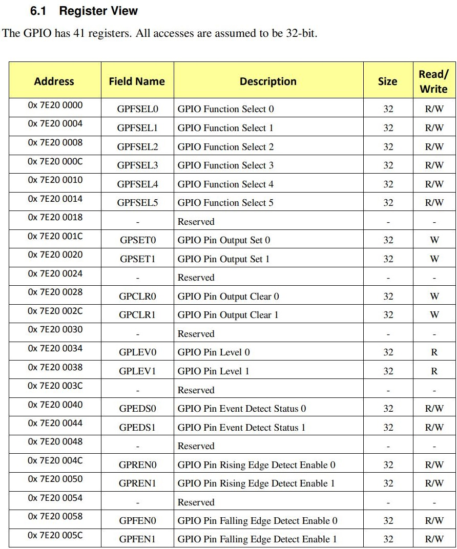 GPIO의 가상 주소 시작점(0x7E200000)은 주변 장치 가상 주소 시작점(0x7E000000)으로부터 0x00200000만큼 떨어져 있다.